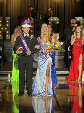 Queen Jocelyn Freed, sitting, and King Gabe McMartin, standing behind her, were crowned the 2025 Grundy Center Homecoming royalty during a coronation ceremony at the high school on Thursday night.
