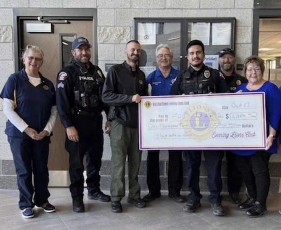 The Marshalltown Evening Lions Club contributed $1,250 to the Fraternal Order of Police/ Marshalltown Police Department’s 2024 annual Hero’s and Helpers “Shop with a Cop” program. Through its Marshalltown Evening Lions Club’s ongoing popcorn sales and other fundraisers, the club can help seed the fund that helps under resourced children who have experienced a traumatic crisis in life due to crime, significant medical challenges and/or natural disasters. The Marshalltown Evening Lions Club, like the FOP Marshalltown is honored to help spread positivity in the Marshalltown Community. We Serve.