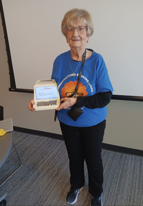 CONTRIBUTED PHOTO Debi Estabrook, Marshalltown Evening Lion’s Club, displays the equipment used to help members perform vision screenings on children from six months to six years old at a recent Twentieth Century meeting.