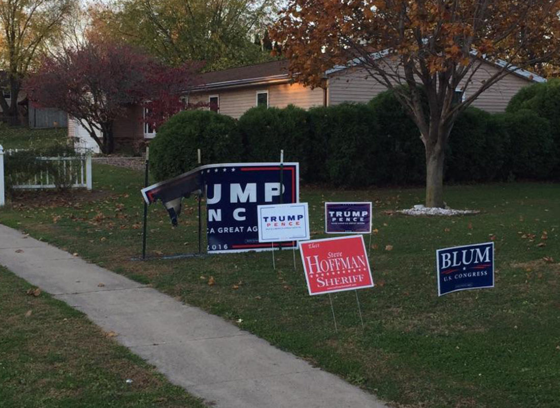 Other Trump-Pence signs on the property have been stolen, knocked-down, or repeatedly vandalized over a period of several weeks, resulting in property owners contacting police and the Times-Republican.