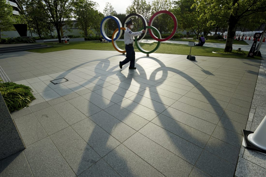 FILE - In this May 9, 2021, file photo, a security guard wearing a protective mask to help curb the spread of the coronavirus walks in front of the Olympic Rings, in Tokyo. Japan, seriously behind in coronavirus vaccination efforts, is scrambling to boost daily shots as the start of the Olympics in July closes in. (AP Photo/Eugene Hoshiko, File)