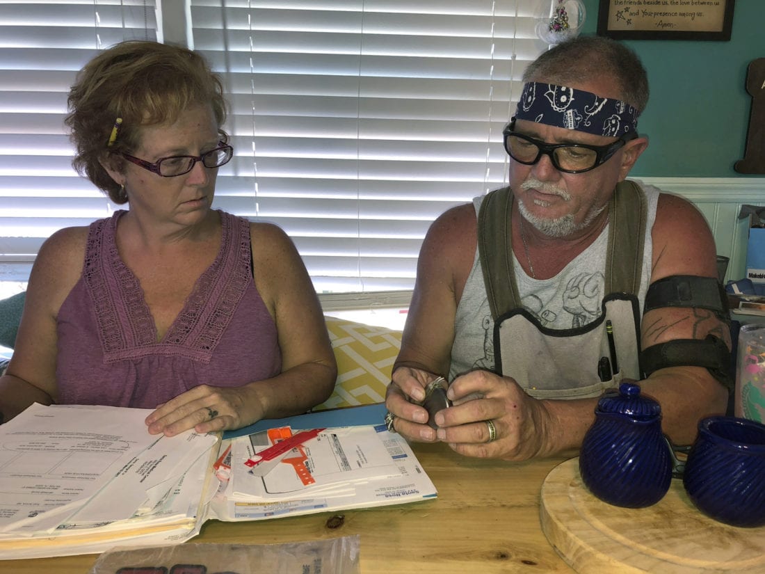 In this Oct. 31 2018 photo, George and Brenda Davis look at his nerve stimulator and medical documents at their home in Milton, Fla. George Davis had three Medtronic spinal-cord implants between 2003 and 2007 after a car accident mangled his back. They temporarily reduced some of his pain, but he said the non-rechargeable batteries that were supposed to last for years never did and he tired of multiple surgical removals. In 2015, he decided to try a Boston Scientific device. But he said he soon started feeling pain shooting down his back and legs and a burning sensation at the implant site. Brenda Davis said Boston Scientific disregarded her complaints after her husband suffered a life-threatening infection following implant surgery. (AP Photo/Holbrook Mohr)