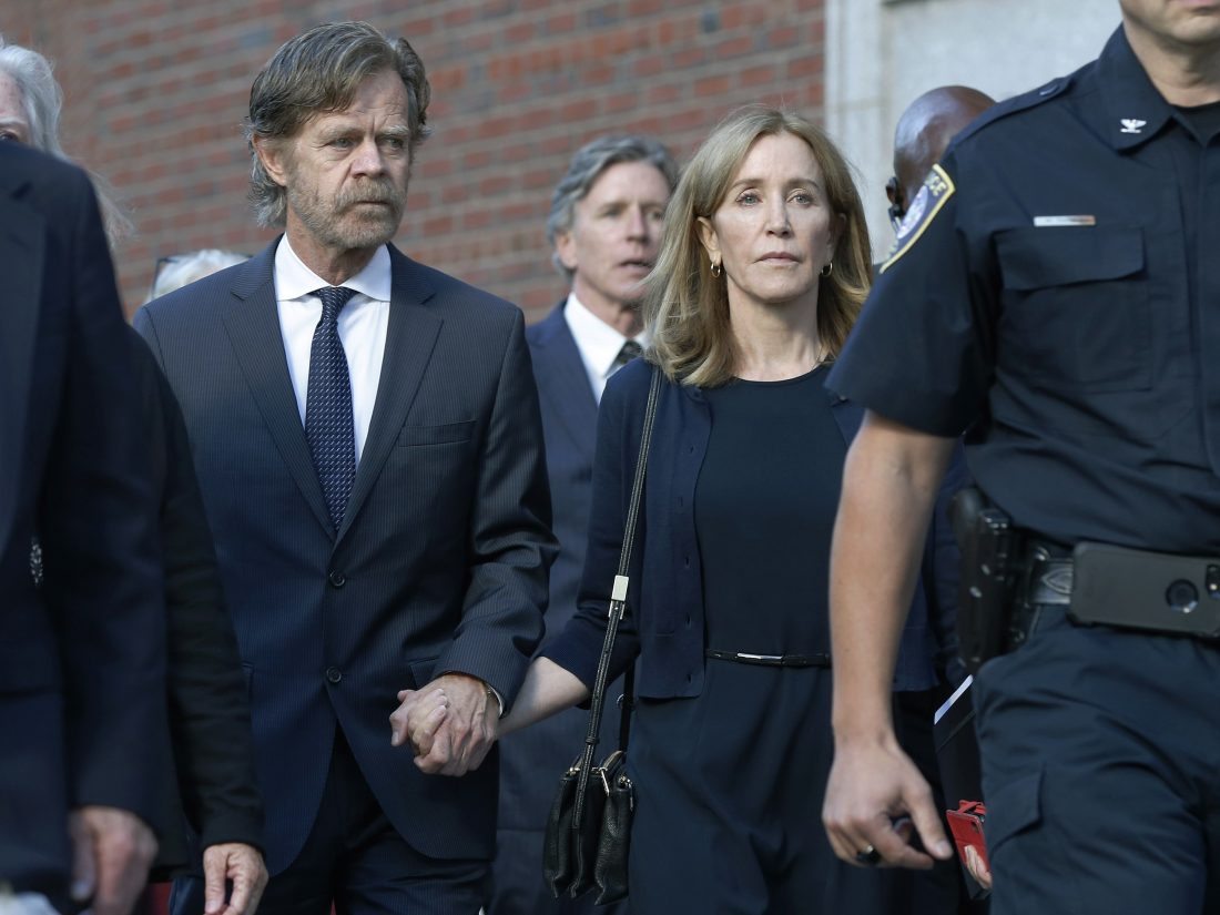 Felicity Huffman leaves federal court with her husband William H. Macy, left, and her brother Moore Huffman Jr. rear center, after she was sentenced in a nationwide college admissions bribery scandal, Friday, in Boston.