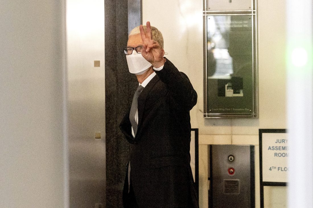 ap photo Apple CEO Tim Cook leaves the Ronald V. Dellums building in Oakland, Calif., after testifying in a federal court case brought by Epic Games on Frida. Epic, maker of the video game Fortnite, charges that Apple has transformed its App Store into an illegal monopoly.