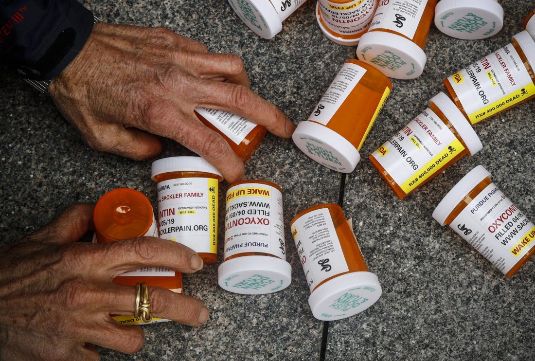 ap photo A protester gathers containers that look like OxyContin bottles at an anti-opioid demonstration in front of the U.S. Department of Health and Human Services headquarters in Washington in 2019.