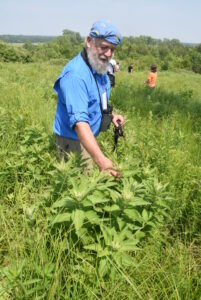 - PHOTOS BY GARRY BRANDENBURG — People with a wide variety of interests related to native prairies descended upon Central Iowa June 26-29. They attended meetings where scientific papers were presented, and discussed successes and strategies to build more interest and appreciation for native grasses and forbs. More than 600 attendees came to portions or all of the conference meetings, and/or field trips. The Marietta Sand Prairie hosted two busloads, one during the 9-11:30 a.m. segment, and another from 2-4:30 p.m. on June 27. Today’s group image is from the afternoon attendees who were happy to explore the original Sand Prairie Preserve and those reconstructed segments nearby. Retired Iowa State University professor Jim Pease examines one prairie plant named Joe-Pye weed. The plant is not a true weed, but a native forb that will have purplish flowers later this month and into August.