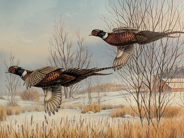 Pheasant hunting in Iowa for its regular season kicks off this weekend. A good supply of rooster pheasants have been determined by several factors. Those factors include a mild winter of 2024 and early 2025 with under 30 inches of snow. A mild and warm spring helped. And lastly the annual roadside count conducted by DNR staff was successful in adding new trend line data to upland game bird survey statistics. Last weekend was the designated yuouth only fall pheasant hunt. The young lad who took his first rooster is Michal Lozinski, age 10. He was assisted by his adult mentor who has a German Wirehaired Pointer dog. The artwork image of flying pheasants is by wildlife artist Rick Morkel that he created in 1991. He captured the beauty of a pair offlying ring-necks over a winter wetland landscape. The local PF banquet will be held on November 1st, 2025 at the Midnight Garden, 1501 South 17th Ave, in Marshalltown.