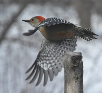This is not to be confused with the true Red-headed Woodpecker Midwesterners will also see each year. A better name for Red-bellies could be Bar-backed or Red-napped Woodpecker. Today’s image is of a Red-bellied taking off from a perch so that its undersides of its wings show alternating patterns of black and white.