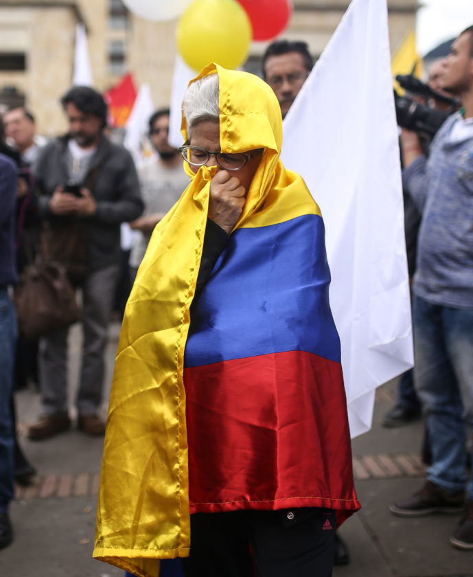 AP PHOTO A woman wrapped in a Colombian flag attends a rally supporting the peace process with rebels of the Revolutionary Armed Forces of Colombia, FARC, in Bogota, Colombia, Thursday.