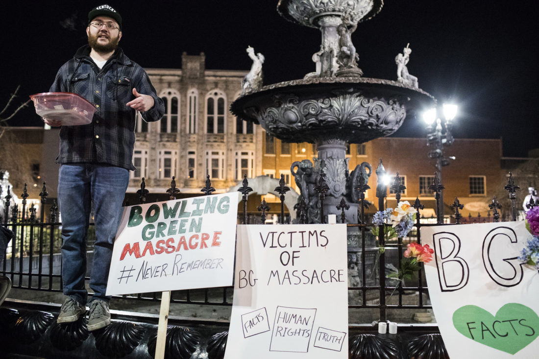 Friday night, a group of people gathered at a Bowling Green park where they lit candles in remembrance of massacre victims.