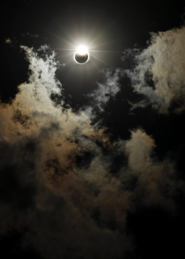 The moon partially blocks out the sun as a solar eclipse is seen through the clouds over the Gateway Arch Monday, Aug. 21, 2017, in St. Louis. The Gateway Arch was just a few miles outside of the path of totality. (AP Photo/Jeff Roberson)
