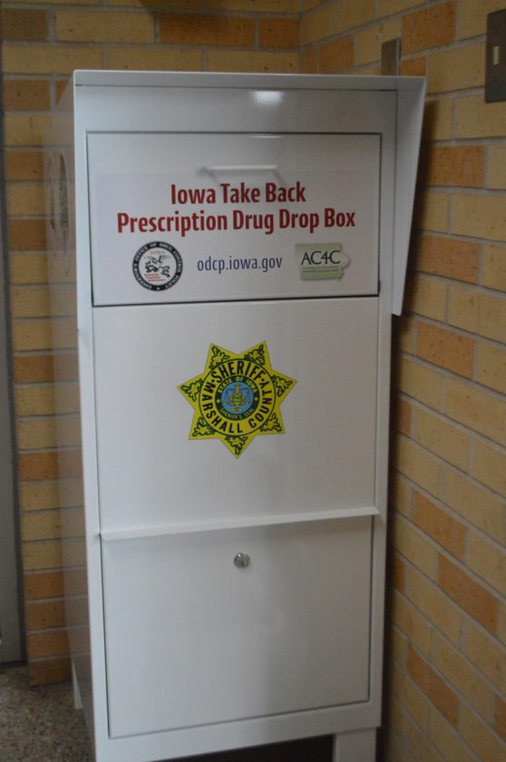 Consequently area law enforcement, in partnership with SATUCI, have been working in partnership three and one-half years to reduce the temptation by encouraging Central Iowans to remove their unused medications from cupboards, medicine cabinets and elsewhere and dropping them off at prescription drug drop-off boxes. There are two in Marshall County — both conveniently located and open like mailboxes for easy disposal. One is in the lobby of MPD Headquarters, 22 N. Center St., and a second in the lobby of the Marshall County Sheriff’s Administrative Office/Jail, 2369 Jessup Ave. Contact with civilian or police personnel is not required at both locations.