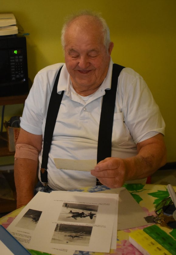 T-R PHOTO BY MIKE DONAHEY U.S. Navy and World War II veteran Max Levis of Marshalltown reacts while looking at vintage photos and papers from a collection in his home recently. Levis is compiling a home-made book of his Navy and war experiences for his grandchildren.