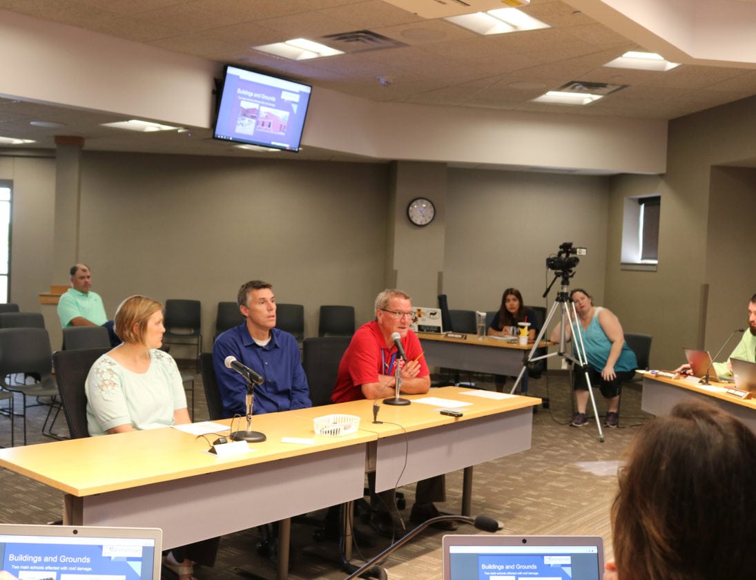 T-R PHOTO BY ADAM SODDERS - District officials shared an update on the damage and recovery efforts the school district has been involved in since the July 19 tornado. The storm damaged three elementary school buildings. District students and staff reached out to the community to help and facilities were used to host relief services as well as food and clothing giveaways. From left: district Food Service Director Lynn Large, District Director of Communications Andrew Potter, District Buildings and Grounds Director Chuck Springer.