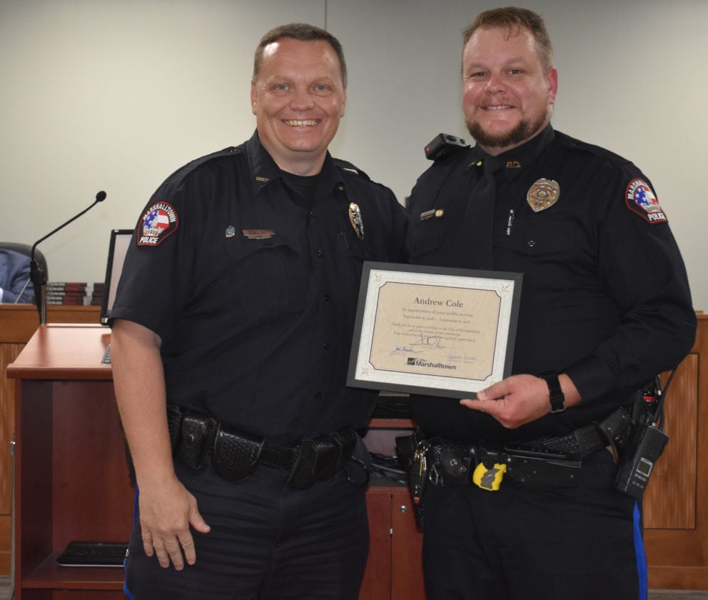 Marshalltown Chief of Police Mike Tupper, left, is pictured with Officer Andrew Cole at a city council meeting in council chambers held earlier this week. Tupper presented Cole with a 10-year employment service award before the city council. Tupper said Cole was passionate about his work in law enforcement and has become a department authority on recognizing drugs. Joining Cole were his wife and two children.