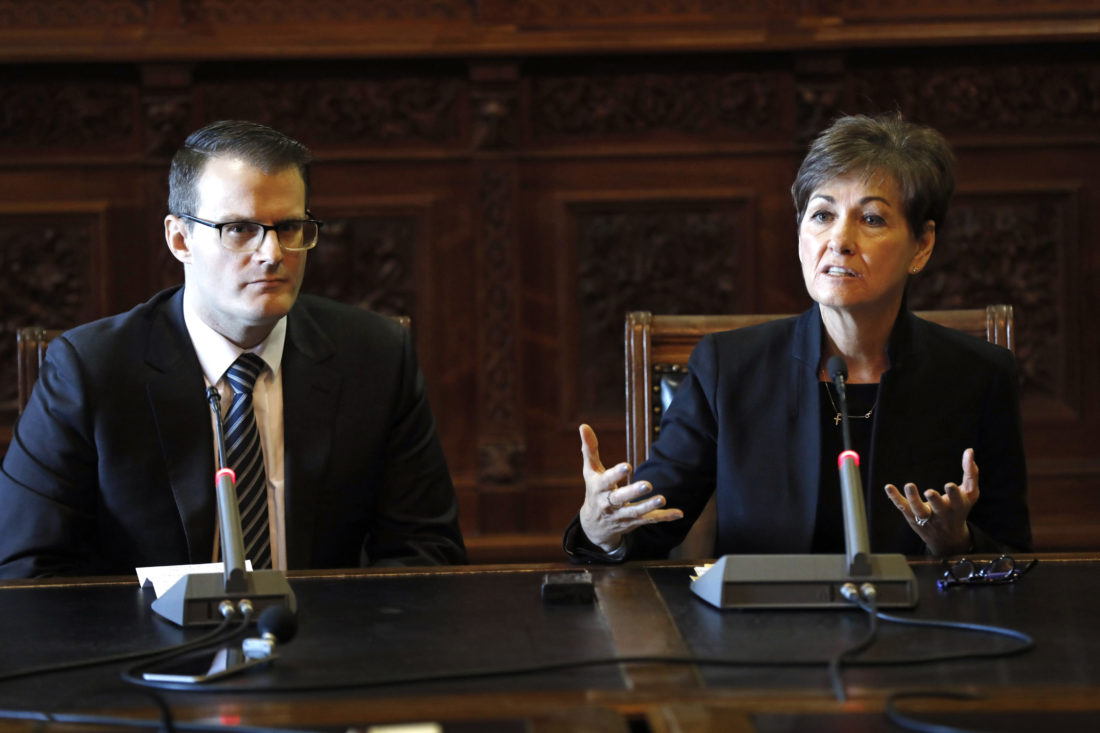 Iowa Gov. Kim Reynolds speaks during The Associated Press' annual Iowa legislative seminar as Lt. Gov. Adam Gregg, left, looks on, Thursday, Jan. 10, 2019, at the Statehouse in Des Moines, Iowa. (AP Photo/Charlie Neibergall)