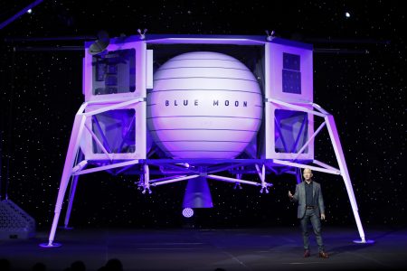 - In this, May 9, file photo, Jeff Bezos speaks in front of a model of Blue Origin’s Blue Moon lunar lander in Washington. Bezos and Virgin Galactic’s Richard Branson favor going back to the moon before Mars. SpaceX’s Elon Musk also is rooting for the moon, although his heart’s on Mars. (AP Photo/Patrick Semansky, File)