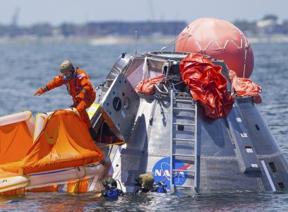 - In this 2017, file photo, NASA astronaut Mike Fincke jumps into a life raft from an Orion capsule the astronauts are using for a recovery test about four miles off of Galveston Island, Texas in the Gulf of Mexico, the first time since the Apollo program that NASA has practiced such egress techniques from a capsule in open water. Astronaut safety is paramount in getting to the moon, according to NASA Administrator Jim Bridenstine. But speed and cost are close seconds. By moving up the target lunar landing date from 2028 to 2024, NASA hopes to retire as much political risk as possible by getting out of the gate fast. (Mark Mulligan/Houston Chronicle via AP, File)