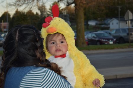 Randolph Bear, 1, was carried by Anay Avila and raked in the candy during the Halloween trunk or treat at Marshalltown High School on Thursday night.