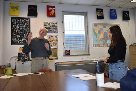 - T-R PHOTO BY ANNA SHEARER Gary Zmolek instructs MHS senior Ashlyn Ruiz on Thursday how to add gestures to her Poetry Out Loud performance.
