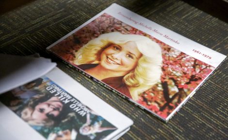 - FILE – Memory books of Michelle Martinko are seen in the courtroom during the trial of Jerry Burns at the Scott County Courthouse in Davenport, Iowa, on Friday, Feb. 14, 2020. Burns was convicted of first-degree murder in the stabbing death of Martinko in 1979. Cedar Rapids Police Department investigator Matt Denlinger was the lead investigator in the 40-year-old cold case. (Jim Slosiarek/The Gazette via AP)
