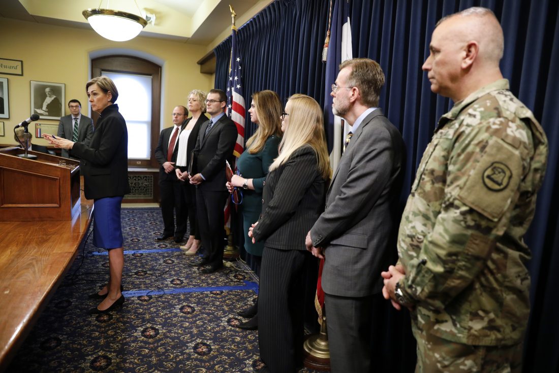 AP PHOTO Gov. Kim Reynolds speaks during a news conference about an update on the state’s response to the new coronavirus outbreak Tuesday at the Statehouse in Des Moines
