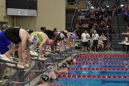 - T-R photo by Anna Shearer Swimmers get in position while supporters watch in the stands at the Y State Swim Meet.