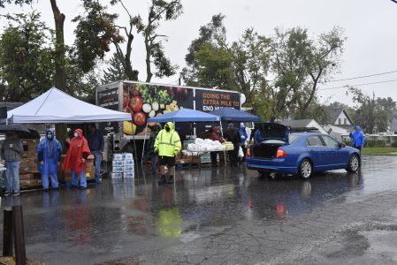 Volunteers stood out in the rain with rubber boots and umbrellas directing cars in line on where to go. Other volunteers moved boxes into open car trunks.