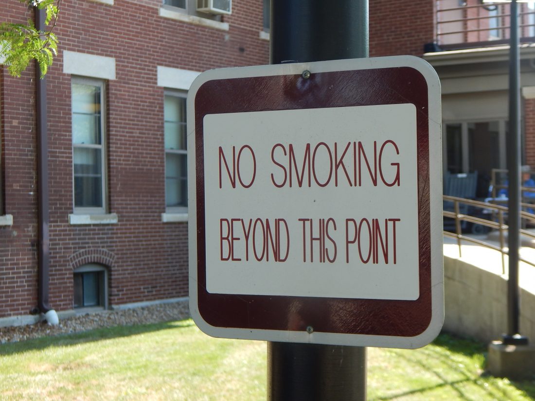 T-R FILE PHOTO A “No Smoking” sign directs Heinz Hall residents where smoking is allowed on the facility’s west side at the Iowa Veterans Home.