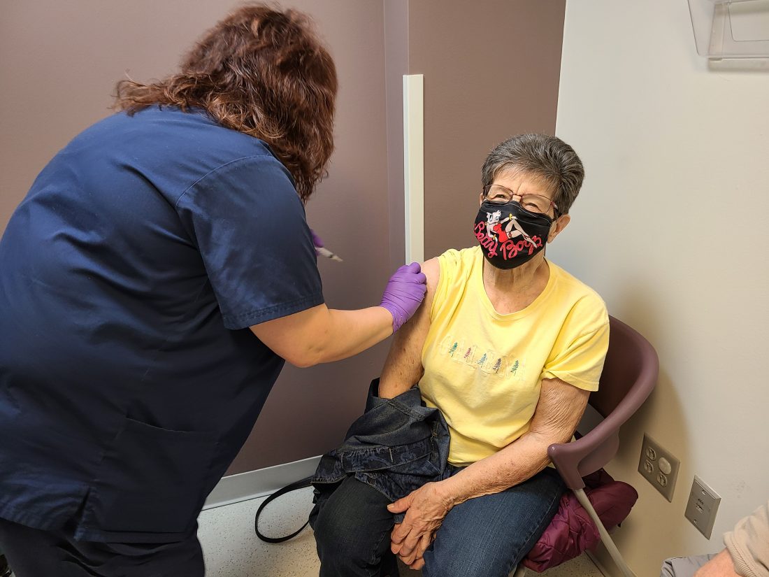 CONTRIBUTED PHOTO Joyce Meyer, 85, of Marshalltown, receives a COVID-19 vaccine from a nurse at the McFarland clinic on Thursday. The health care provider began Phase 1B of the COVID-19 vaccine distribution.