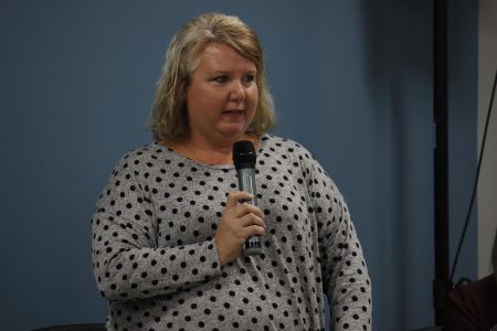 - Marshalltown school board candidate Bonnie Lowry addresses the audience during her opening remarks at the school board candidate forum Tuesday night hosted at the Veterans Memorial Coliseum. (From left to right: Bonnie Lowy, Robert Maharry, John Hall, Rebecca Kouang, Leah Stanley and Zachary Wahl.)