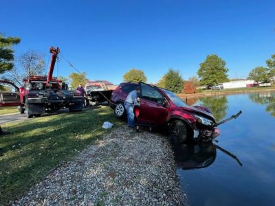 - PHOTO COURTESY OF JASON WEGNER — A Larry’s Towing vehicle removed a Subaru SUV from the pond outside of the Fisher Community Center after the driver lost control on Tuesday morning. There were no injuries, but the vehicle is likely totaled.
