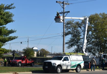 - T-R PHOTO BY ROBERT MAHARRY — Crews from Alliant Energy and Centurylink work to repair damaged lines on W. Anson St. after a single vehicle accident on Tuesday morning.