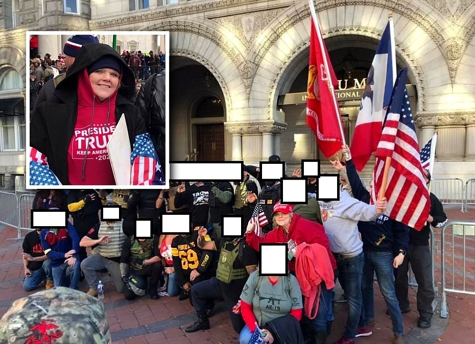 CONTRIBUTED PHOTO Deborah Sandoval of Des Moines (inset) is trying to prevent prosecutors from using this photo, redacted by the government, allegedly showing Sandoval posing with members of the Proud Boys in the weeks before the Jan. 6 riot at the U.S. Capitol.