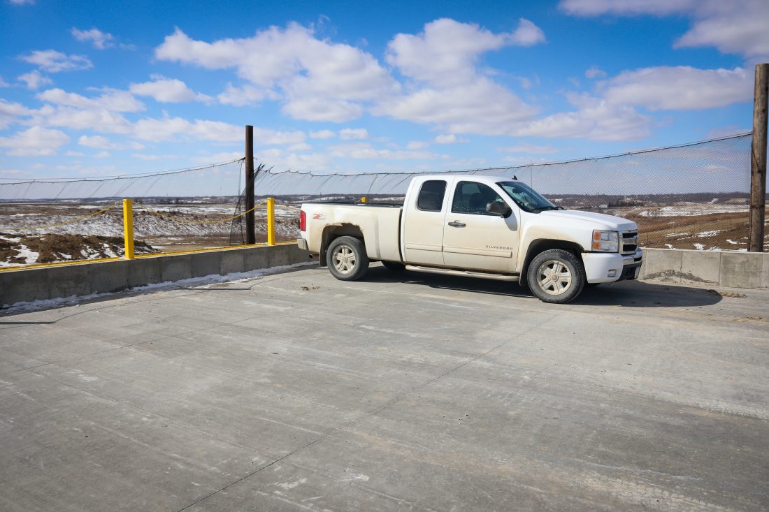 At the newly constructed convenience center at the Tama County Landfill, customers are able to back in their vehicles or trailers onto a concrete pad and then dump their load of landfill materials off a ledge into a pair of 30-yard roll-off dumpsters that staff are able to easily empty in the primary section of the landfill.