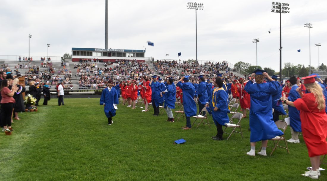 MHS seniors toss their caps at the conclusion of Sunday afternoon's commencement ceremony.