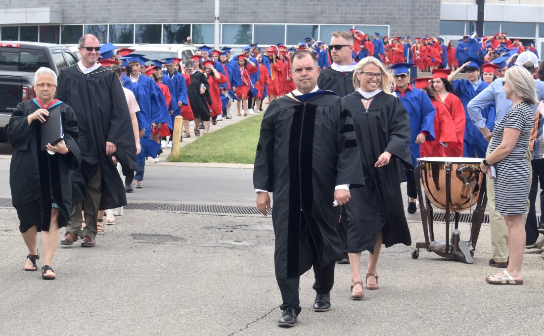 T-R PHOTO BY ROBERT MAHARRY — MCSD Superintendent Theron Schutte, front right, and high school principal Jacque Wyant, front left, lead the class of 2022 onto Leonard Cole Field.