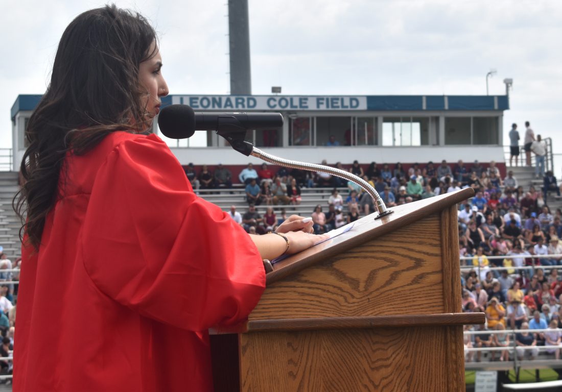 T-R PHOTO BY ROBERT MAHARRY — Andrea Montes Melendez spoke about her journey as a recent immigrant to the U.S. and learning English at the MHS commencement ceremony.