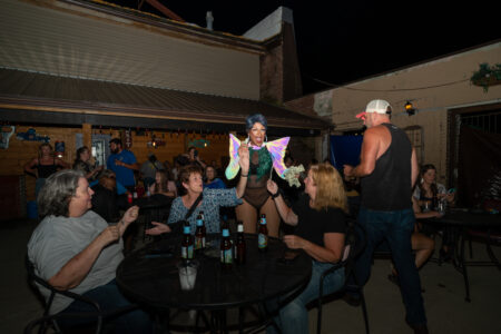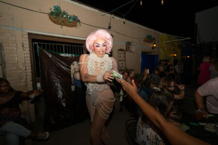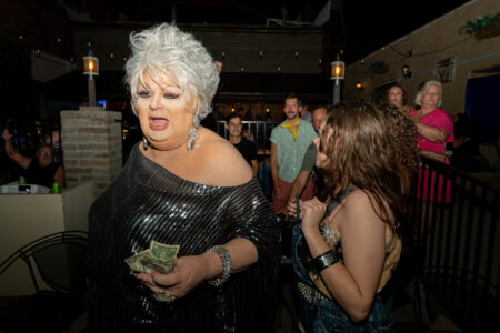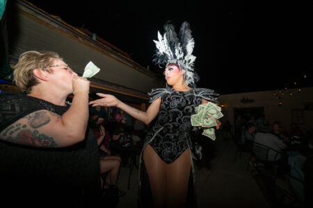 Anyone who got there late waited in line for a $10 ticket at the entrance to the back patio from inside the main bar. When the door opened, a drag queen in a purple sequined dress was juggling fists full of cash as men and women screamed, holding dollars in the air waiting their turn to get closer to the glamorous performers as they strutted and posed through the crowd.