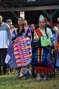 - Powwow Princess Irene Keahna, right, and Jr. Princess Sade Kapayou, left, followed by their families dance to the Honor Song, commemorating current and past princesses.