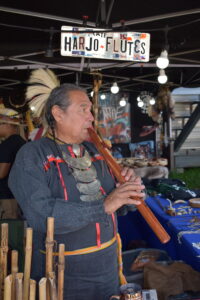 - William Harjo of the Sequoyah tribe in Oklahoma plays the flute for guests from his booth, where he’s selling his CDs and hand-carved flutes.
