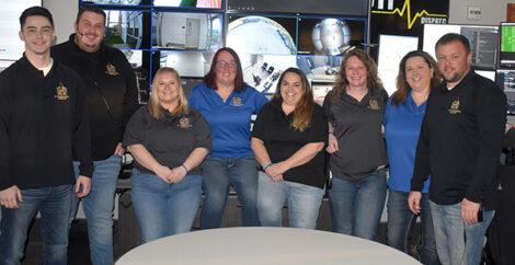 - T-R PHOTOS BY ROBERT MAHARRY — Several members of the Marshall County 911 Dispatch team — from left to right, Max Chapman, Zac Mann, Alyssia Klosterman, Tiffany Eibs, Shannon Wegner, Kayla Ball, Director Rhonda Braudis and Shane Andrews — pose for a photo at their office inside of the Marshalltown Police/Fire station on Tuesday morning. April 9-15 is National Public Safety Telecommunicators Week.