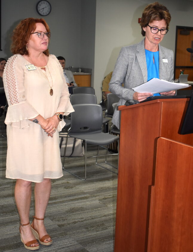 T-R PHOTO BY ROBERT MAHARRY — Marshalltown Central Business District Executive Director Deb Millizer, left, and MCBD Board President Cindy Parks, right, addressed the city council during Monday night’s regular meeting.