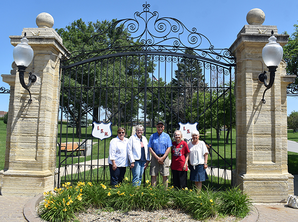 T-R PHOTO BY ROBERT MAHARRY From left to right, Roseanne Anderson of the Central Iowa Quilt Sew-Ciety, Sue Kitzman of the Conrad American Legion Auxiliary Unit 681, Marshalltown Combined VFW/American Legion Honor Guard Commander Bob Miller, Deloris Clayton of the VFW Auxiliary Post 839 and Marshall County American Legion Auxiliary President Deb Miller pose for a photo in front of the Iowa Veterans Home on Monday. All of their organizations will be honored with Governor’s Volunteer Awards during a ceremony set to be held at Ankeny Centennial High School on Thursday afternoon.