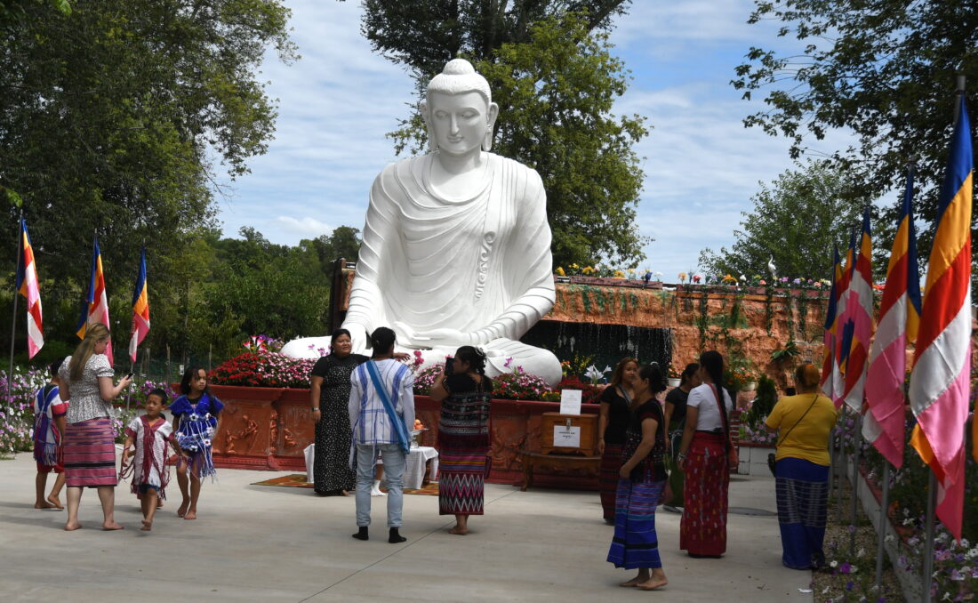 T-R PHOTO BY JAKE RYDER — Visitors gather in front of the Buddha statue at the Theravada Dhamma Society of Iowa’s annual festival, believed to be one of the largest of its kind in the United States, just outside of Marshalltown on Sunday afternoon.