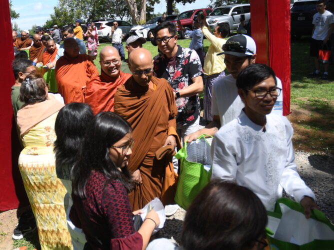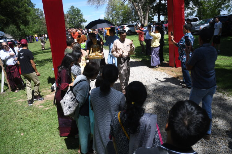 Dozens of monks from across the United States participated in the Sunday afternoon Sangha Donation ceremonies, as attendees lined the gravel path down to the festival grounds offering donations of money or supplies to help the monks. The donations fulfill financial needs of the temple and pay for future projects like a planned expansion of the Yaw Nwe Dhamma Center that will include a Buddhist school, as required by the religion.