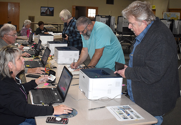 T-R PHOTO BY ROBERT MAHARRY From left to right, Lois Ruth, Ken Vergauwen and Mike Ruth, all of Marshalltown, check in to vote in the special election at Redeemer Lutheran Church on Tuesday afternoon. Voters soundly rejected the franchise fee, and Greg Nichols was elected to the Third Ward city council seat, representing the southwest quadrant of the city.