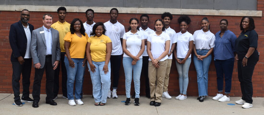 T-R PHOTO BY ROBERT MAHARRY — A group of 10 seniors from the Piney Woods School in rural Rankin County, Miss., who are pictured alongside School President Will Crossley, Dean of Faculty Monica Crossley, Chief of Staff Renee Tillman and Marshalltown Mayor Joel Greer, toured the community on Friday and posed for a photo outside of Franklin Elementary School. Laurence C. Jones, the founder of Piney Woods, was the first African-American to graduate from Marshalltown High School in 1903.