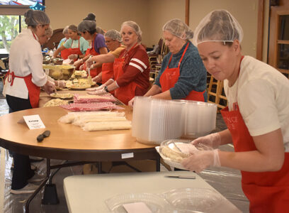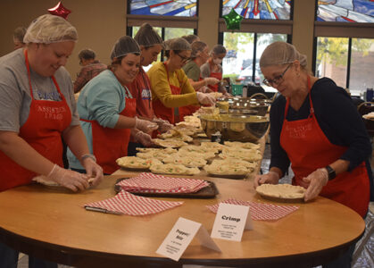 The 40 members of the Assistance League of Marshalltown came together at the First Presbyterian Church Thursday morning to prepare hundreds of pot pies as part of the organization’s first annual chicken pot pie fundraiser. Pickup is Friday, Oct. 20 from 4 to 7 p.m. and Saturday, Oct. 21 from 8 a.m. to noon in the First Presbyterian Church parking lot at 101 S. Center St. Limited pies that were not pre ordered will be available for sale for $20. Cash, checks and Venmo will be accepted.