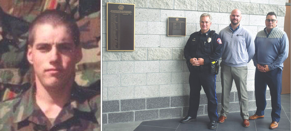 At left, a young Jody Anderson is pictured in uniform during his Army days. At right, Anderson (far right), who owns Anderson Funeral Homes of Marshalltown with additional locations in Conrad and Gladbrook, is pictured alongside his business partner Brandon Lenehan and Marshalltown Police Department Capt. Chris Jones after making a donation for a plaque that commemmorates deceased MPD officers and K9 units. Anderson enlisted in the Army in 1988 and spent 43 days on active duty during Operation Desert Storm.